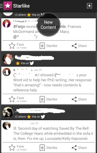 Starlike hayatımızdaki üç ana sosyal ağı destekler - Facebook, Twitter ve LinkedIn, ancak Instagram veya Google Plus'ı desteklemez. Bu hesapların herhangi birinde veya tamamında oturum açtığınızda, arkadaşlarınız/bağlantılarınız/takip ettiğiniz kişiler tarafından beğenilen veya favorilere eklenen tüm içeriğin bir zaman çizelgesi sunulur. Bu gönderilere 'yıldız' eklediğinizde, ilgili sosyal ağda beğeni veya favori olarak görünecektir. Facebook, Twitter ve LinkedIn'i tekrar kontrol ettiğimde bu güvenilir görünüyordu.
